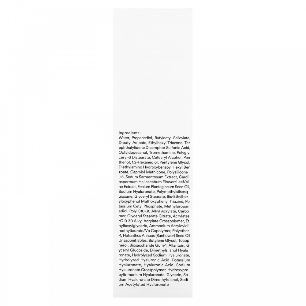 Вода, пропандіол, бутилоктил саліцилат, дибутиладипат, етилгексил триазон, терефталілідендикамфорсульфонова кислота, октилдодеканол, трометамін, полігліцерил-3 дистеарат, цетеариловий спирт, пантенол, 1,2-гександіол, пентиленгліколь, діетиламіно гідроксибензоїлгексилбензоат, каприліл метикон, полісилікон-15, екстракт очитку шкіряного (Sedum sarmentosum)., екстракт квіток, листя й виноградної лози кардіоспермума (Cardiospermum halicacabum)., олія з насіння подорожника (Echium plantagineum)., гіалуронат натрію, поліметилсилсесквіоксан, гліцерил стеарат, біс-етилгексилоксифенол метоксифеніл триазин, цетилфосфат калію, метилпропандіол, полі C10-30 алкілакрилат, карбомер, гліцерил стеарат цитрат, кросполімер акрилатів/C10-30 алкілакрилату, етилгексилгліцерин, амонію акрилоїлдиметилтаурату / ВП сополімер, поліефір — 1, неомилювальні речовини з насіння соняшнику (Helianthus annuus)., бутиленгліколь, токоферол, біосахаридна камедь-1, алантоїн, гліцерил глюкозид, диметилсиланолу гіалуронат, гідролізований гіалуронат натрію, гідролізована гіалуронова кислота, гіалуронат калію, гіалуронова кислота, кросполімер гіалуронату натрію, гідроксипропілтримонію гіалуронат, гліцерин, гіалуронат натрію диметилсиланол, ацетильований гіалуронат натрію.