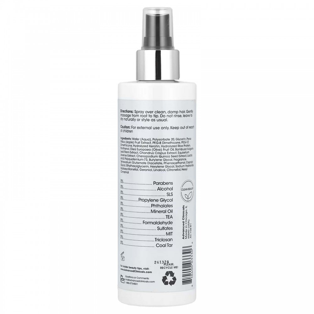 Незмивний кондиціонер Advanced Clinicals для гладкості та блиску волосся — це зручний спрей, який захищає, кондиціонує та розгладжує волосся. Кератин надає волоссю м’якість і шовковистість, роблячи його менш схильними до пушіння. Кератин розгладжує клітини волосся та бореться із сухістю.