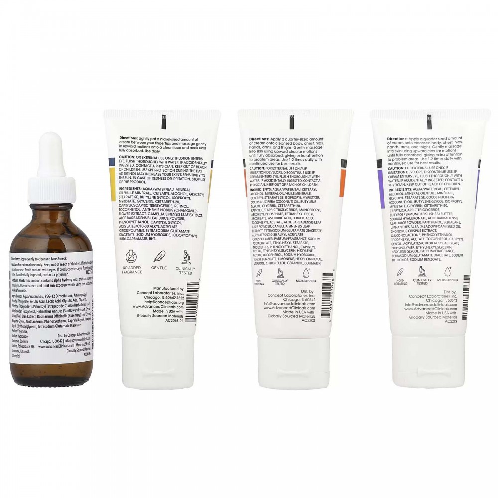 Набір містить:Advanced Clinicals, сироватка для освітлення з вітаміном C, 52 мл (1,75 рідк. унції)Advanced Clinicals, зміцнювальний крем із ретинолом, 59 мл (2 рідк. унції)Advanced Clinicals, покращен...