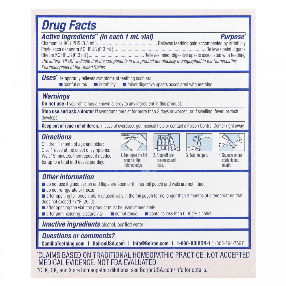 Boiron, Camilia, засіб для зняття болю при прорізуванні зубів, для немовлят від 1 місяця і старше, 15 відміряних рідких доз, 1 мл