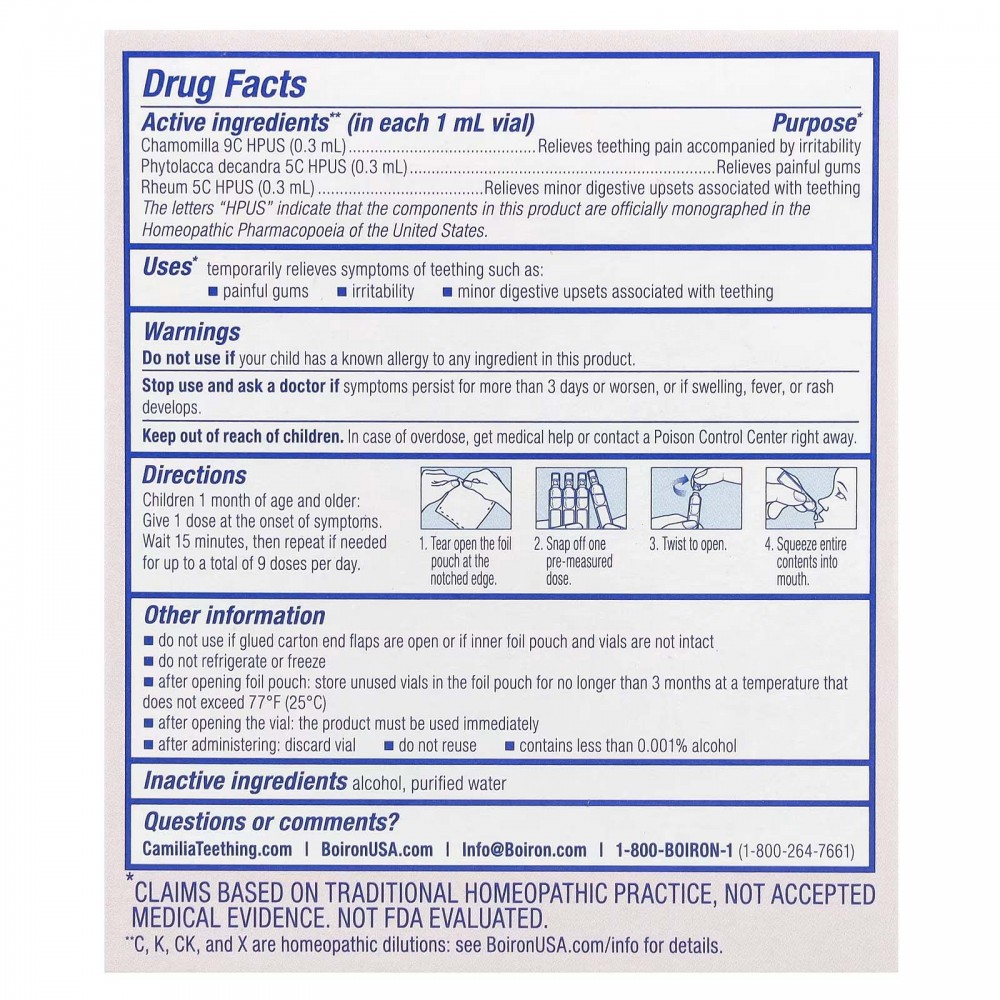 Boiron, Camilia, засіб для зняття болю під час прорізування зубів, для немовлят від 1 місяця та старше, 30 відміряних рідких доз, по 1 мл