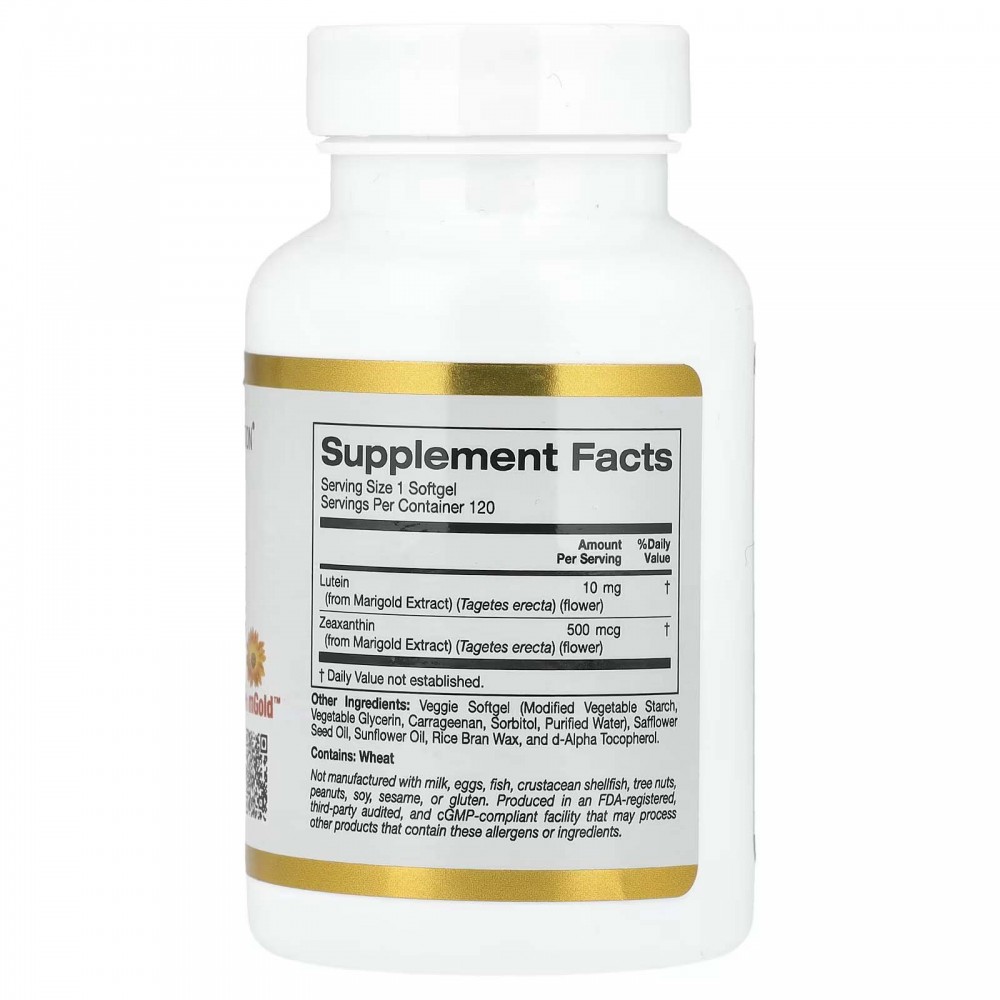 Лютеїн від California Gold Nutrition містить екстракт чорнобривців mGold™, отриманий із квіток чорнобривців (Tagetes erecta), і містить лютеїн і зеаксантин. За умови приймання згідно з рекомендаціями препарату вистачає на 4 місяці споживання.