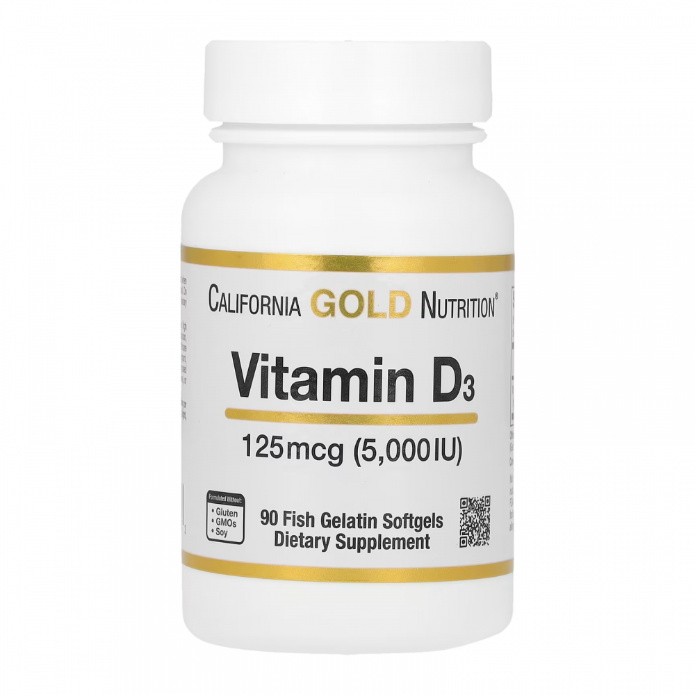 Вітамін D3 (125 мкг / 5000 МО) від California Gold Nutrition® — це високоефективна добавка з вітаміном D, яка містить холекальциферол у капсулах із риб’ячого желатину.