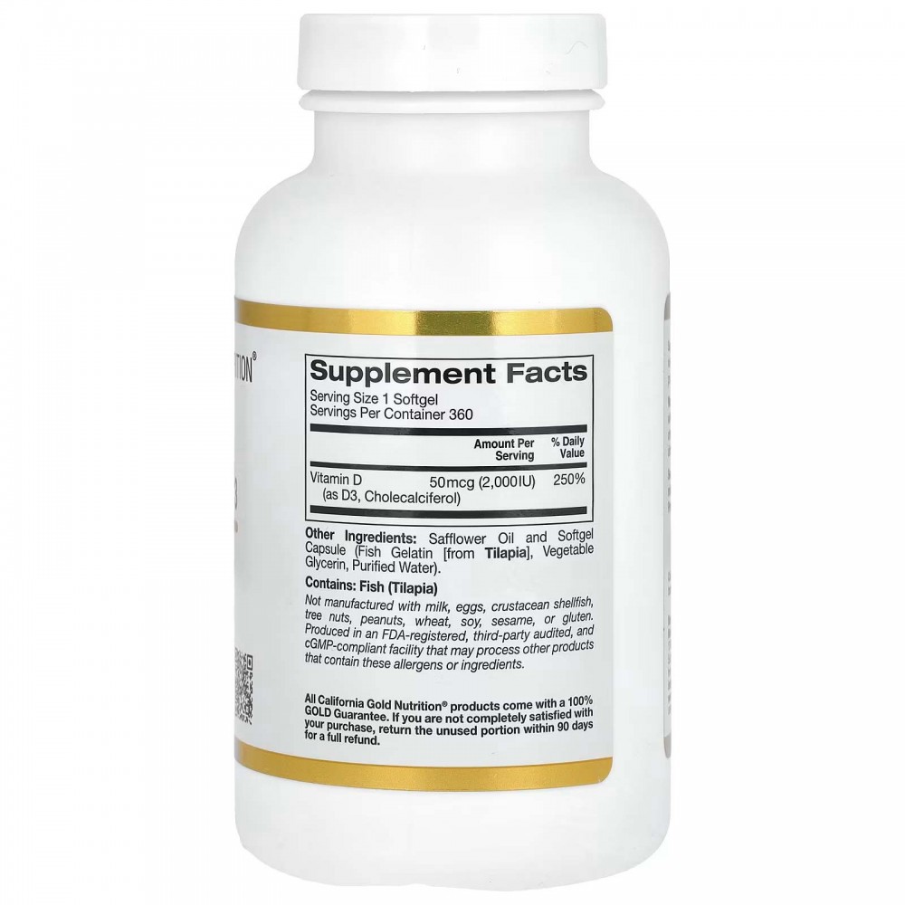 California Gold Nutrition, вітамін Д3, 50 мкг (2000 МО), 360 капсул із рибячого желатину (Основний склад)