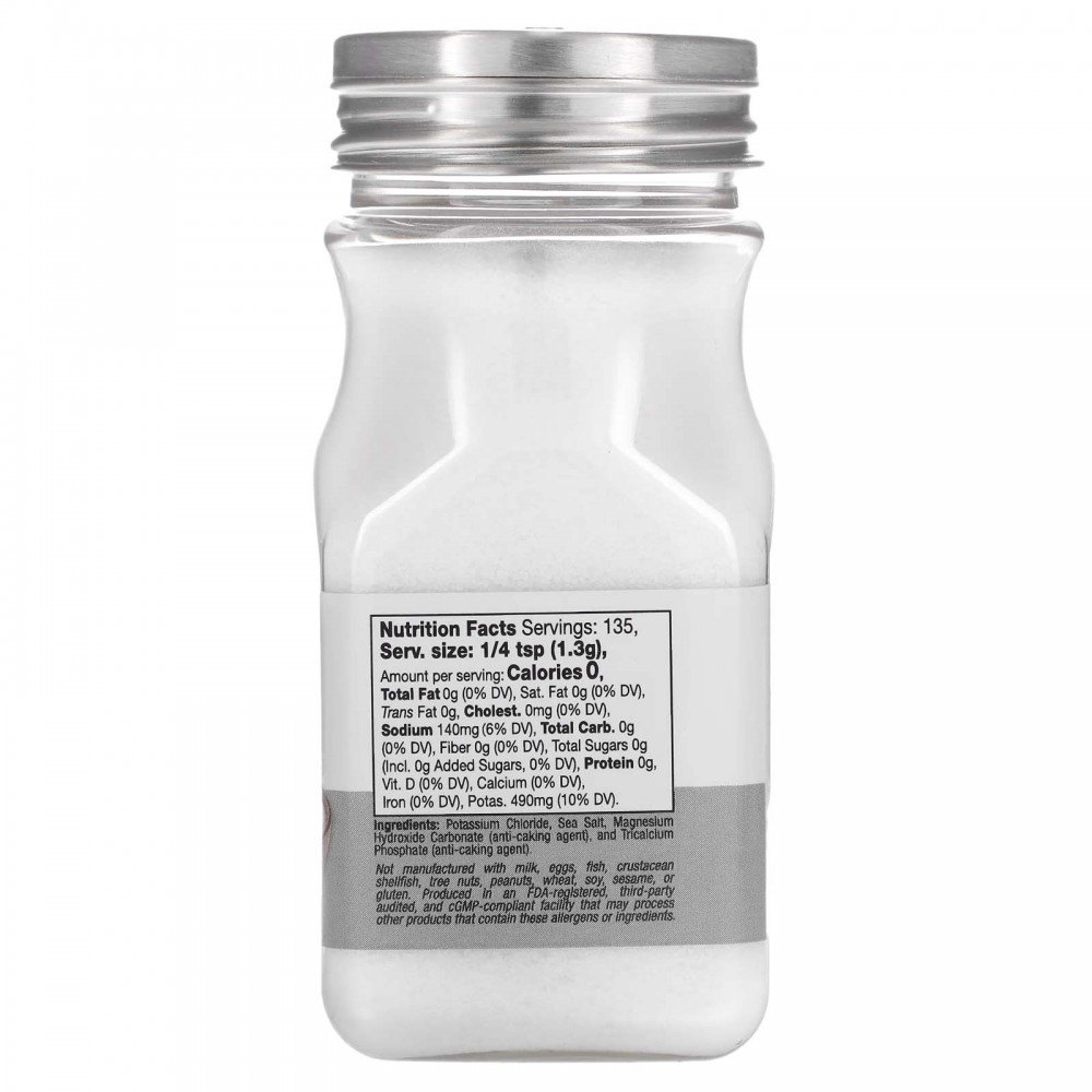 Легка морська сіль California Gold Nutrition — це суміш морської солі та хлориду калію. Вона містить 140 мг натрію на порцію, що значно менше, ніж у звичайній столовій солі (590 мг на порцію).
