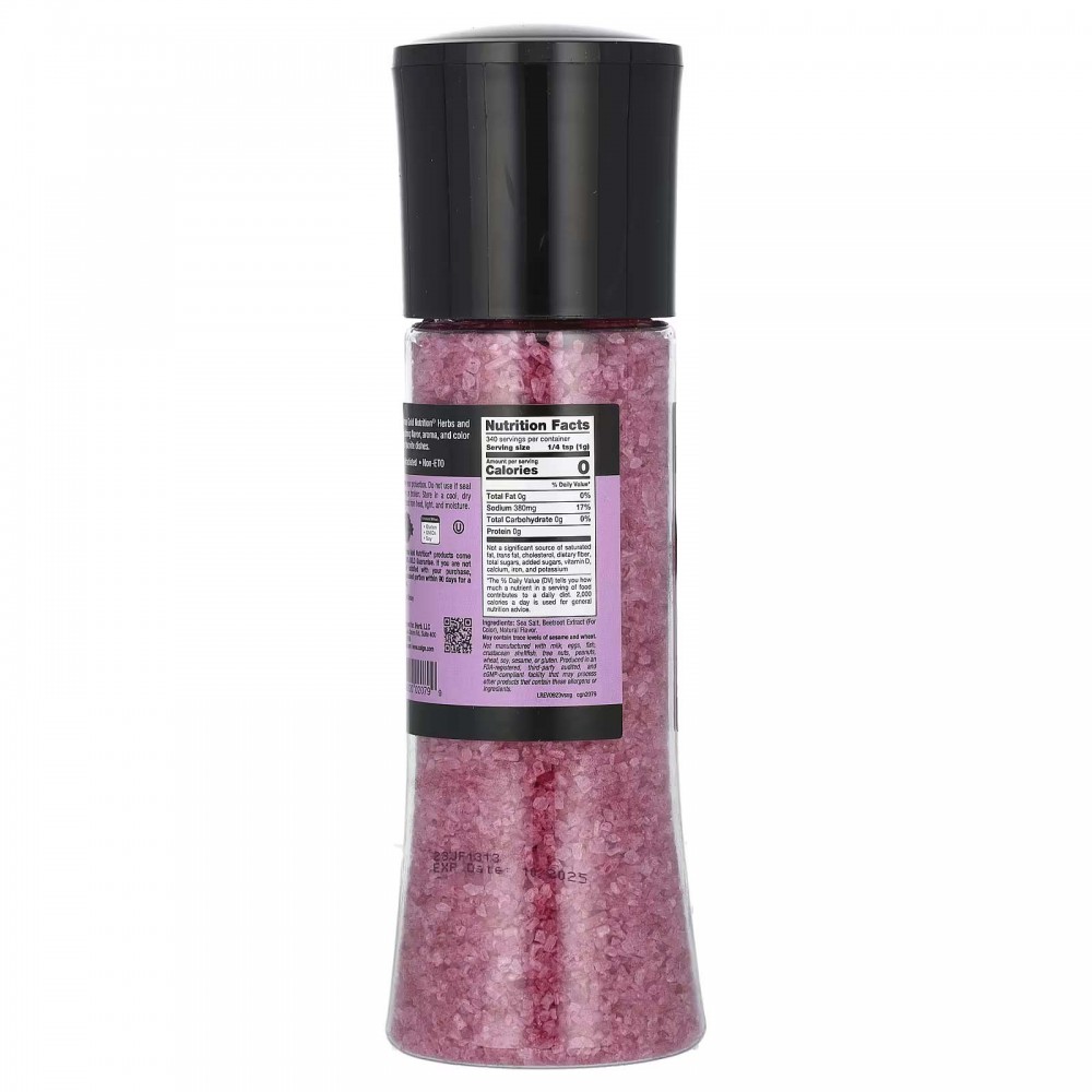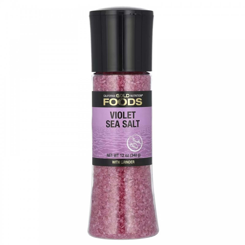 Фіолетова морська сіль у млинку California Gold Nutrition® FOODS містить морську сіль фіолетового відтінку для надання стравам смаку та легкого кольору. Використовуйте цей млинок, щоб подрібнити кристали над своїми улюбленими стравами під час приготування, у такий спосіб створюючи яскравий ароматний смак.