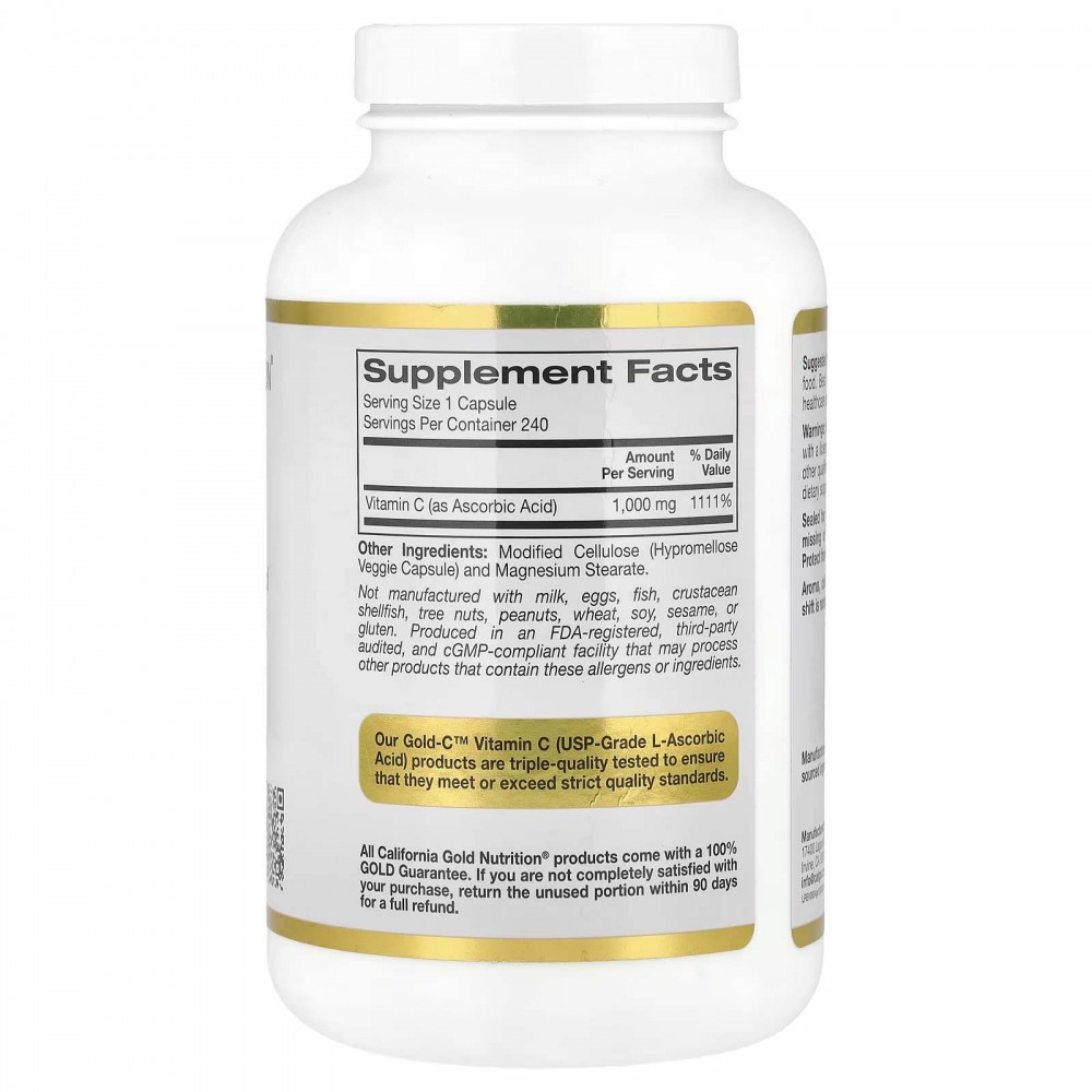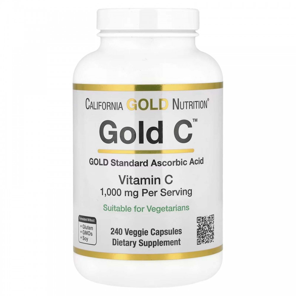 Засіб Gold C™ від California Gold Nutrition містить вітамін C класу USP (у вигляді аскорбінової кислоти) у вегетаріанських капсулах. Ця добавка підходить для вегетаріанців, не містить глютену, ГМО та сої.