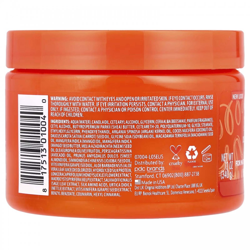 Містить масло ши, кокосову олію, олію авокадо, мигдалеву олію, олію з насіння жожоба, оливкову олію, олію з насіння макадамії, олію з насіння манго, олію з кісточок моркви та олію з виноградних кісточок, які глибоко проникають у стрижень волосся для інтенсивного догляду та відновлення. відновлює та зміцнює сухе пошкоджене волосся.