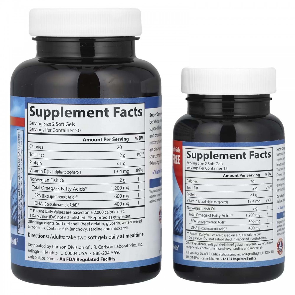 Carlson, Super Omega-3 Gems, омега-3 кислоти з риби дикого вилову, 1200 мг, 100 капсул (600 мг у капсулі)
