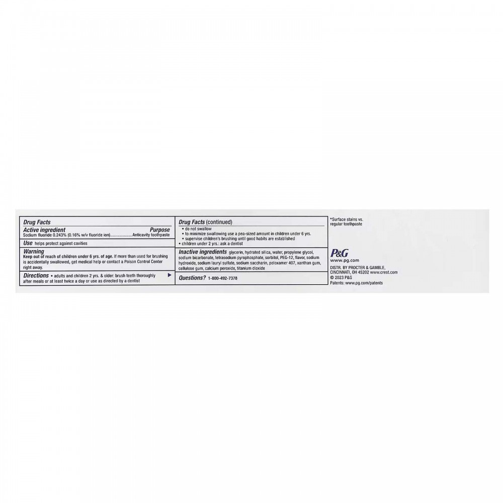 гліцерин, гідратований діоксид кремнію, вода, пропіленгліколь, бікарбонат натрію, тетранатрію пірофосфат, сорбітол, ПЕГ-12, ароматизатор, гідроксид натрію, лаурилсульфат натрію, сахарин натрію, полоксамер 407, ксантанова камедь, целюлозна камедь, пероксид кальцію, діоксид титану.