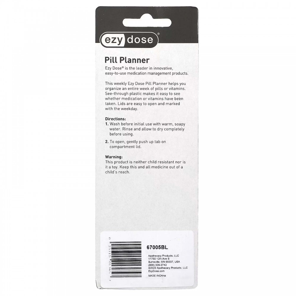 Цей щотижневий планувальник таблеток Ezy Dose® допоможе організувати прийом таблеток і вітамінів на весь тиждень. Прозорий пластик дає змогу легко визначити, чи приймалися препарати або вітаміни. Кришки легко відкриваються та містять день тижня.