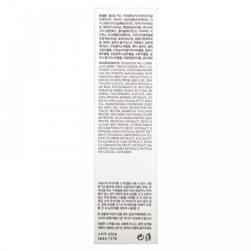 Мед (38,7 %), каприловий/каприновий тригліцерид, ПЕГ-7 гліцерил кокоат, дистеардимонію гекторит, олія з горіхів макадамії (Macadamia integrifolia), соняшникова олія (Helianthus annuus), пентиленгліколь, мікрокристалічний віск, полісорбат 20, масло ши (Butyrospermum parkii), бджолиний віск, токоферилацетат, екстракт ядер арганії (Argania spinosa)., олія з насіння фундука (Corylus avellana)., олія з насіння жожоба (Simmondsia chinensis), фільтрат секреції равлика, вода, вода бамбука звичайного (Bambusa vulgaris), квіткова вода лотоса індійського (Nelumbo nucifera), вода з листя алое вера (Aloe barbadensis)., екстракт прополісу, бета-глюкан, бджолина отрута, екстракт плодів грейпфрута (Citrus paradisi), екстракт кореня софори вузьколистої (Sophora angustifolia), екстракт квіток гвоздичного дерева (Eugenia caryophyllus), екстракт листя евкаліпта кулястого (Eucalyptus globulus), екстракт плодів граната (Punica granatum), екстракт бамбука звичайного (Bambusa vulgaris), бутиленгліколь, гліцерин.