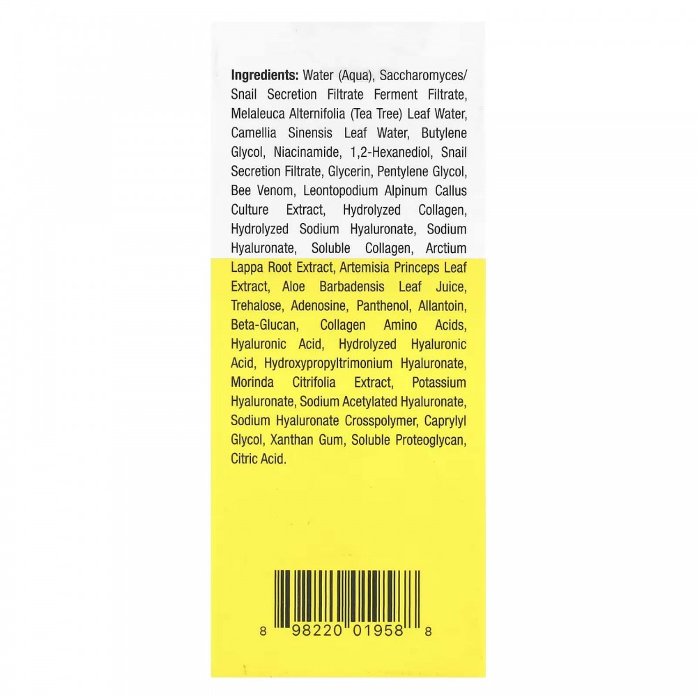 Вода (Aqua), Saccharomyces/фільтрат ферментації секреції равлика, вода з листя чайного дерева (Melaleuca alternifolia), вода з листя зеленого чаю (Camellia sinensis), бутиленгліколь, нікотинамід, 1,2-гександіол, фільтрат секрету равлика, гліцерин, пентиленгліколь, бджолина отрута, екстракт калусної культури едельвейса альпійського (Leontopodium alpinum), гідролізований колаген, гідролізований гіалуронат натрію, гіалуронат натрію, розчинний колаген, екстракт кореня лопуха великого (Arctium lappa), екстракт листя японського полину (Artemisia princeps), сік листя алое вера (Aloe barbadensis), трегалоза, аденозин, пантенол, алантоїн, бета-глюкан, колагенові амінокислоти, гіалуронова кислота, гідролізована гіалуронова кислота, гідроксипропілтримонію гіалуронат, екстракт моринди лимонолистої (Morinda citrifolia), гіалуронат калію, ацетильований гіалуронат натрію, кросполімер гіалуронату натрію, каприлілгліколь, ксантанова камедь, розчинний протеоглікан, лимонна кислота.