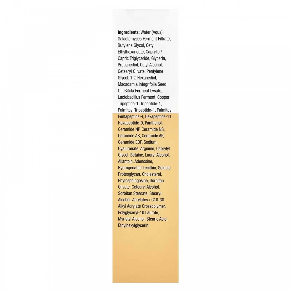 Вода (Aqua), фільтрат ферменту галактоміцетів, бутиленгліколь, цетилетилгексаноат, каприловий/каприновий тригліцерид, гліцерин;, пропандіол, цетиловий спирт, Цетеарил оліват, пентиленгліколь, 1,2-гександіол, олія з насіння макадамії (Macadamia integrifolia)., лізат біфідоферментів, Фермент лактобактерій, Трипептид міді-1, Трипептид-1, Пальмітоїл трипептид-1, пальмітоїл пентапептид-4, Гексапептид-11, гексапептид-9, пантенол, керамід NP, Керамід NS, Керамід AS, Керамід AP, Керамід EOP, гіалуронат натрію, Аргінін, каприлілгліколь, бетаїн, лауриловий спирт, алантоїн, аденозин, гідрогенізований лецитин, розчинний протеоглікан, Холестерин, фітосфінгозин, сорбітан оліват, цетеариловий спирт, сорбітан стеарат, стеариловий спирт, Кросполімер акрилатів / C10-30 алкілакрилату, полігліцерил-10 лаурат, міристиловий спирт, стеаринова кислота, етилгексилгліцерин.
