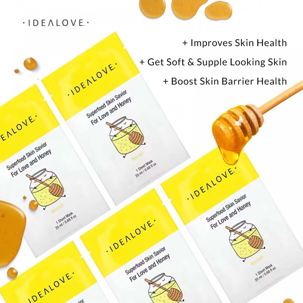 Влаштуйте собі спа вдома завдяки масці із суперфудами Superfood Skin Savior, мед від Idealove®. Ця маска із суперфудами насичена тонізуючим медом, який допомагає підтримувати нормальний бар’єр і робить шкіру м’якою та підтягнутою на вигляд. Маска виготовлена з гладенької, наче шовк, тканини, що допомагає максимально підвищити вбирання есенції та надати шкірі сяяння.