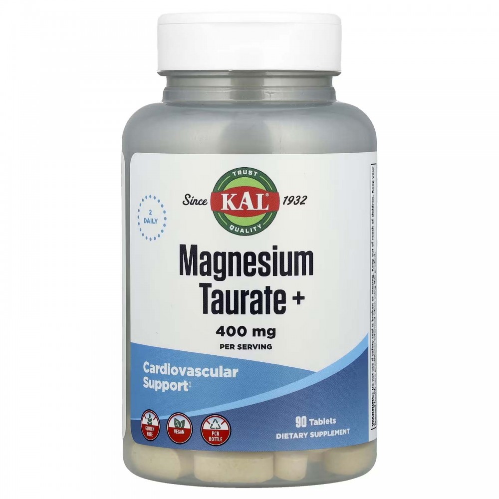 Інформація про продукт. Таурат магнію+ від KAL® містить мікроелемент магній і амінокислоту таурин у вільній формі. Таурат магнію+ забезпечує поживну підтримку для здоров’я кісток, серцево-судинної системи, м’язів, розслаблення, клітинної енергії, здоров’я зубів і роботи нервів. Піридоксаль-5-фосфат (вітамін B6) може забезпечити поживну підтримку для нормального синтезу еритроцитів.