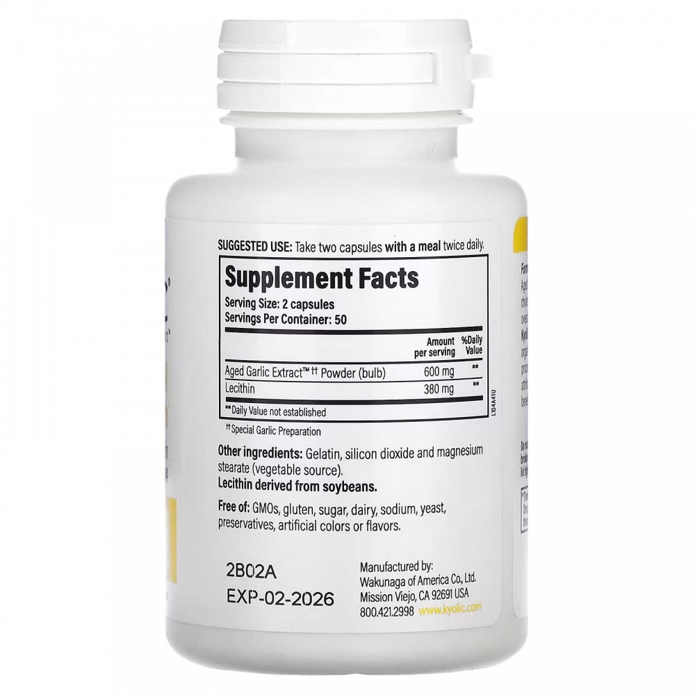 Для виробництва екстракту Aged Garlic Extract™ від Kyolic® використовується тільки органічний часник, вирощений у Каліфорнії. Потім він особливим чином витримується, щоб під час екстракції отримати бездоганний продукт, збагачений корисними сполуками, але без характерного часникового запаху. Така технологія виробництва застосовується тільки в компанії Kyolic. Поєднання лецитину та екстракту часнику Aged Garlic Extract допомагає зберігати рівень холестерину в здорових людей у межах норми й підтримує здоров’я серцево-судинної системи.