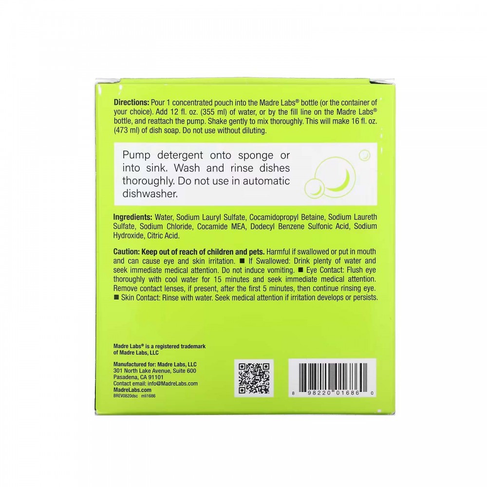 Рекомендації щодо застосування. Вилийте 1 пакетик концентрату до флакона Madre Labs® або іншого флакона за вашим вибором. Додайте 355 мл (12 рідк. унцій) води або налийте воду до лінії наповнення на флаконі Madre Labs® і встановіть дозатор. Акуратно збовтайте, щоб ретельно перемішати вміст флакону. Ви отримаєте 473 мл (16 рідк. унцій) засобу для миття посуду. Не використовувати нерозбавлений продукт.
