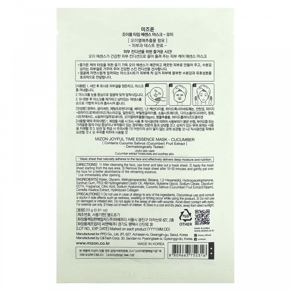 Mizon, Joyful Time, маска-есенція, огірок, 1 шт., 23 г