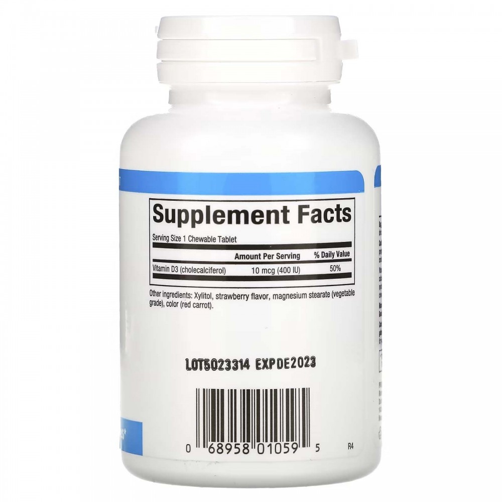 Вітамін D3 необхідний для міцності кісток і зубів, оскільки збільшує засвоєння організмом кальцію з їжею. Завдяки регулюванню рівня кальцію він також допомагає контролювати роботу імунної системи та підтримувати здоров’я нервів і м’язів. Жувальні таблетки зі смаком полуниці, підсолоджені ксилітом (низькокалорійним підсолоджувачем із низьким глікемічним індексом).