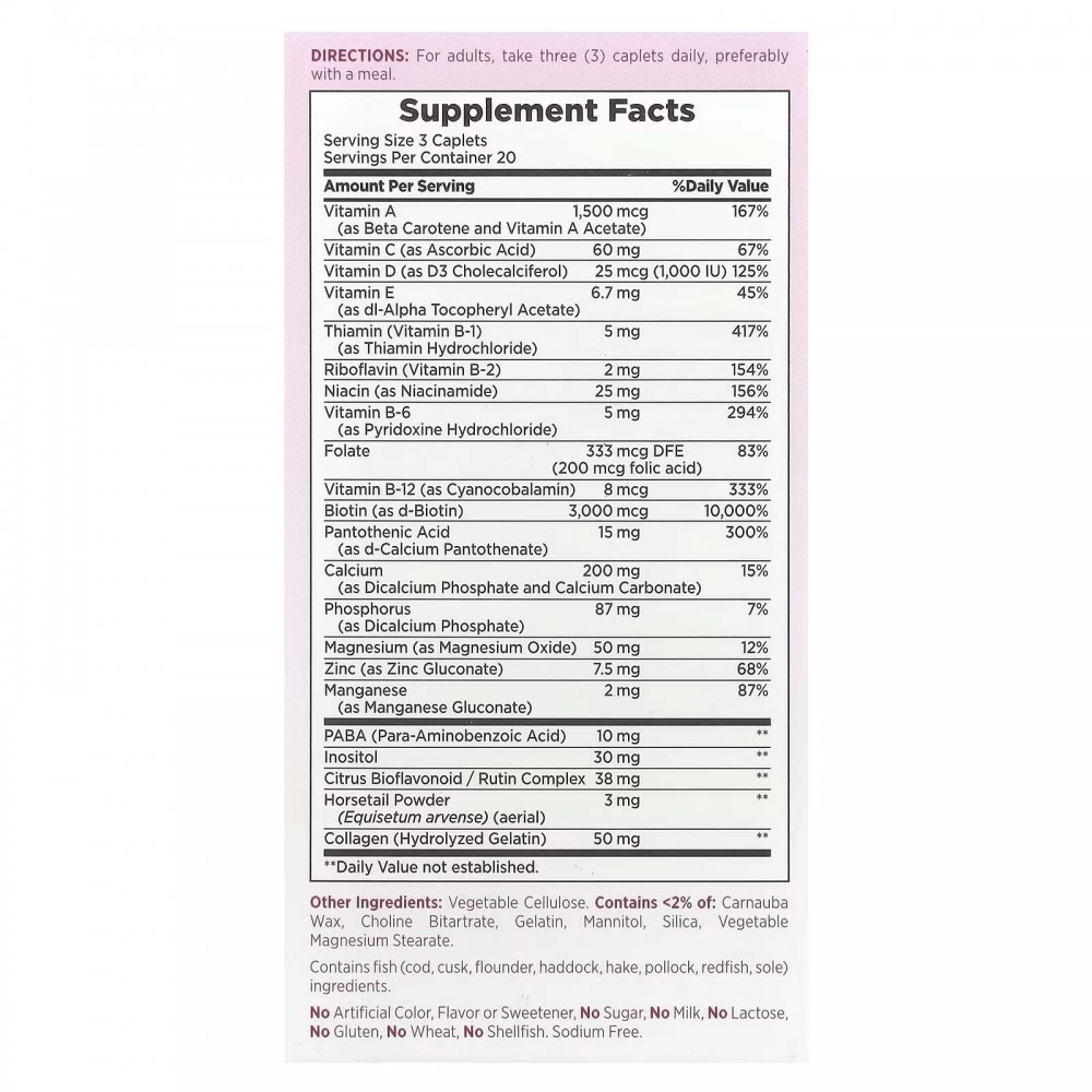 Ця інноваційна формула забезпечує життєво важливі поживні речовини, необхідні організму для підтримки природної краси зсередини. Вітаміни групи B сприяють енергетичному обміну, а біотин допомагає підтримувати здоров’я волосся та нігтів. Вітаміни E та C є антиоксидантами. Вітамін C бере участь у виробленні та формуванні колагену, який є основою для здорової шкіри. Вітамін A допомагає підтримувати нормальний стан шкіри й гарне самопочуття загалом.