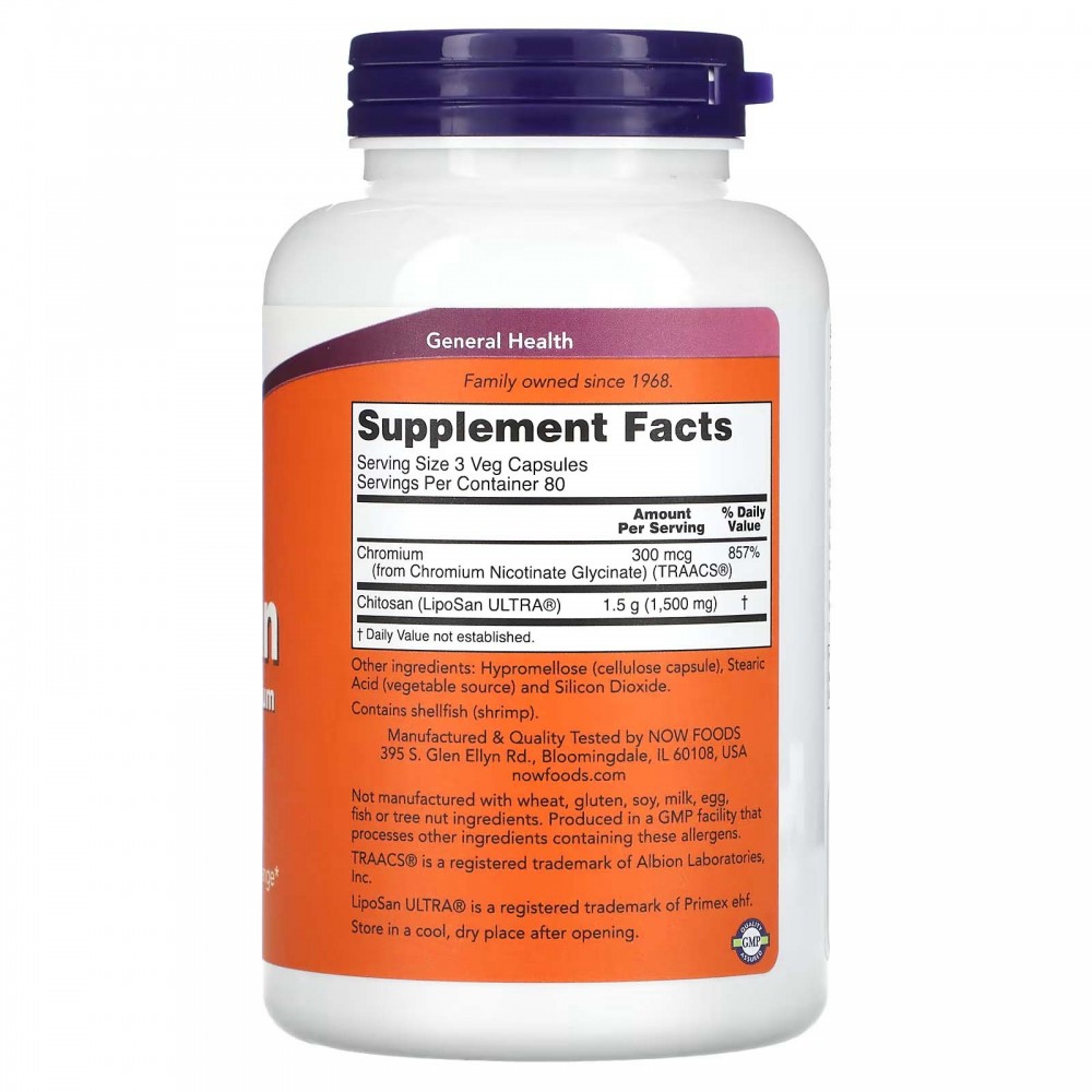 Хітозан — це полісахарид, отриманий з оболонок ракоподібних, який може зв'язуватися з жиром і холестерином в травному тракті, допомагаючи підтримувати рівень холестерину в межах здорового діапазону. Хітозан NOW® містить LipoSan Ultra®, унікальну форму хітозану високої щільності, яка пов'язує в п'ять разів більше жиру, ніж звичайний хітозан, що було лабораторно підтверджено. Результати проведеного клінічного дослідження довели, що LipoSan Ultra® може допомогти в підтримці здорової ваги тіла. Хром, мінерал, необхідний для нормального метаболізму глюкози, був включений до цієї формули.