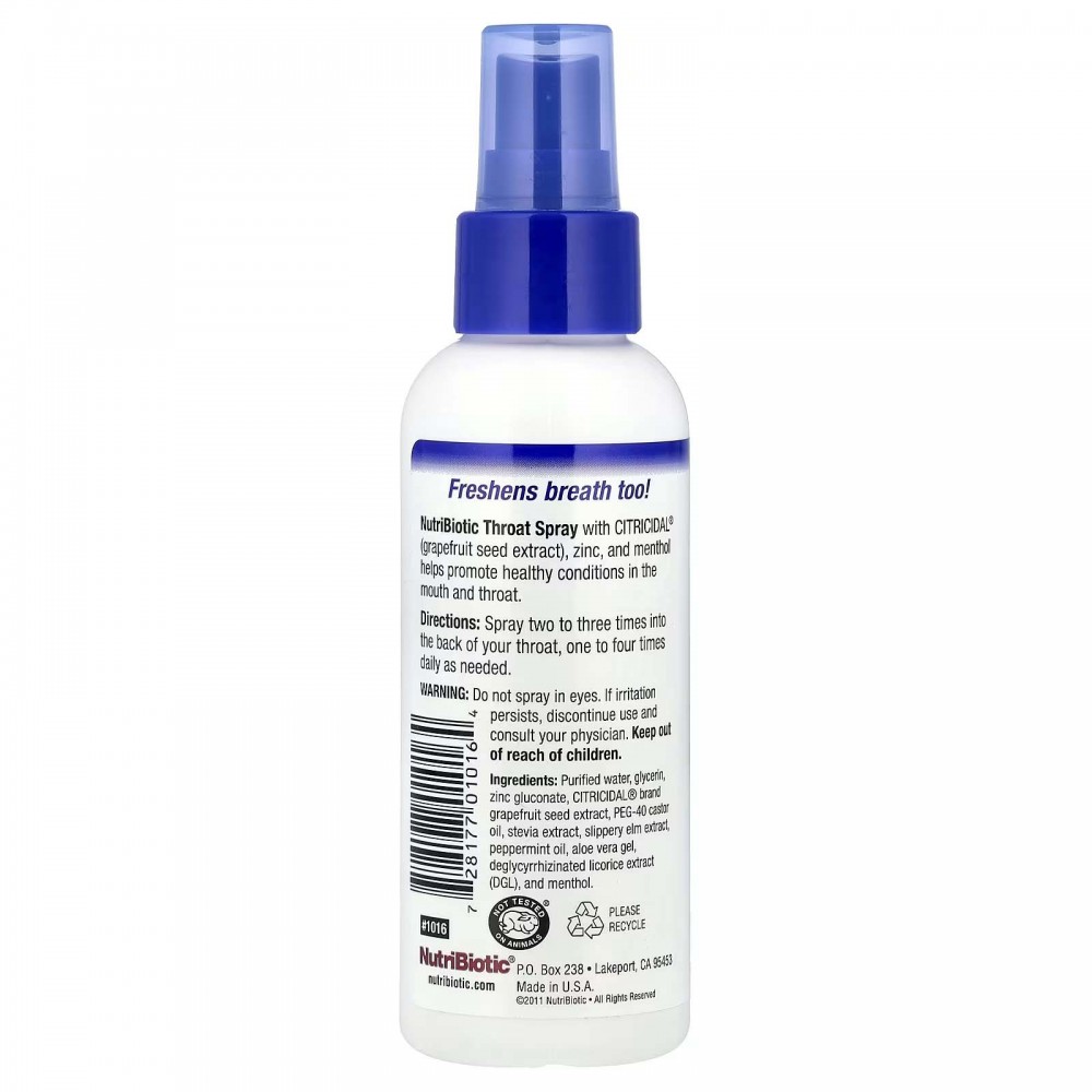 Where Science Works NaturallyОсвіжає диханняНе тестується на тваринахСпрей для горла NutriBiotic з цитрицидом (екстракт насіння грейпфрута), цинком та ментолом сприяє зміцненню здоров’я ротової порожн...
