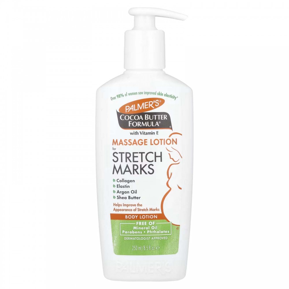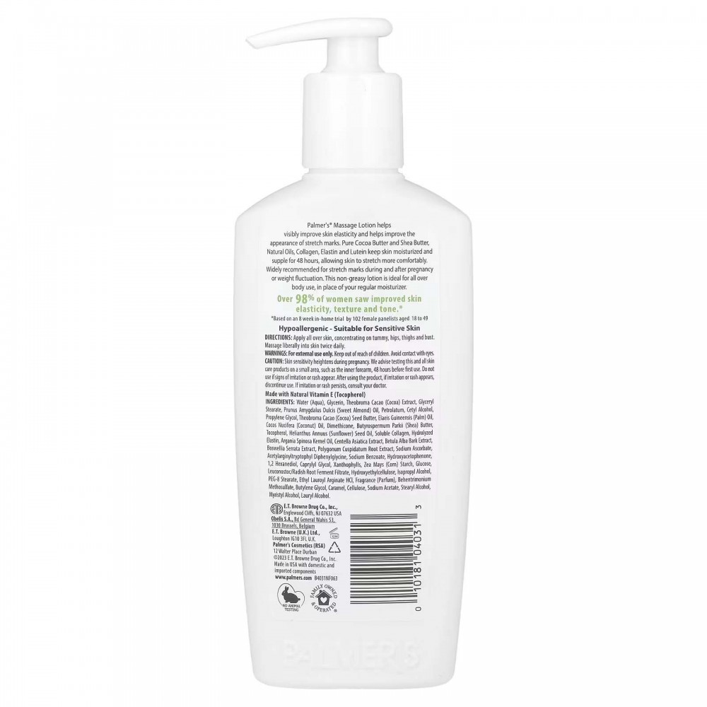 Лосьйон для масажу Palmers® допомагає помітно підвищити еластичність шкіри та візуально зменшити розтяжки. Чисті масла какао та ши, натуральні олії, колаген, еластин і лютеїн підтримують зволоження шкіри та підтягують її протягом 48 годин, завдяки чому шкіра стає еластичнішою. Рекомендовано від розтяжок під час або після вагітності чи в період зміни ваги. Цей нежирний лосьйон ідеально підходить для використання по всьому тілу замість звичайного зволожувального крему.