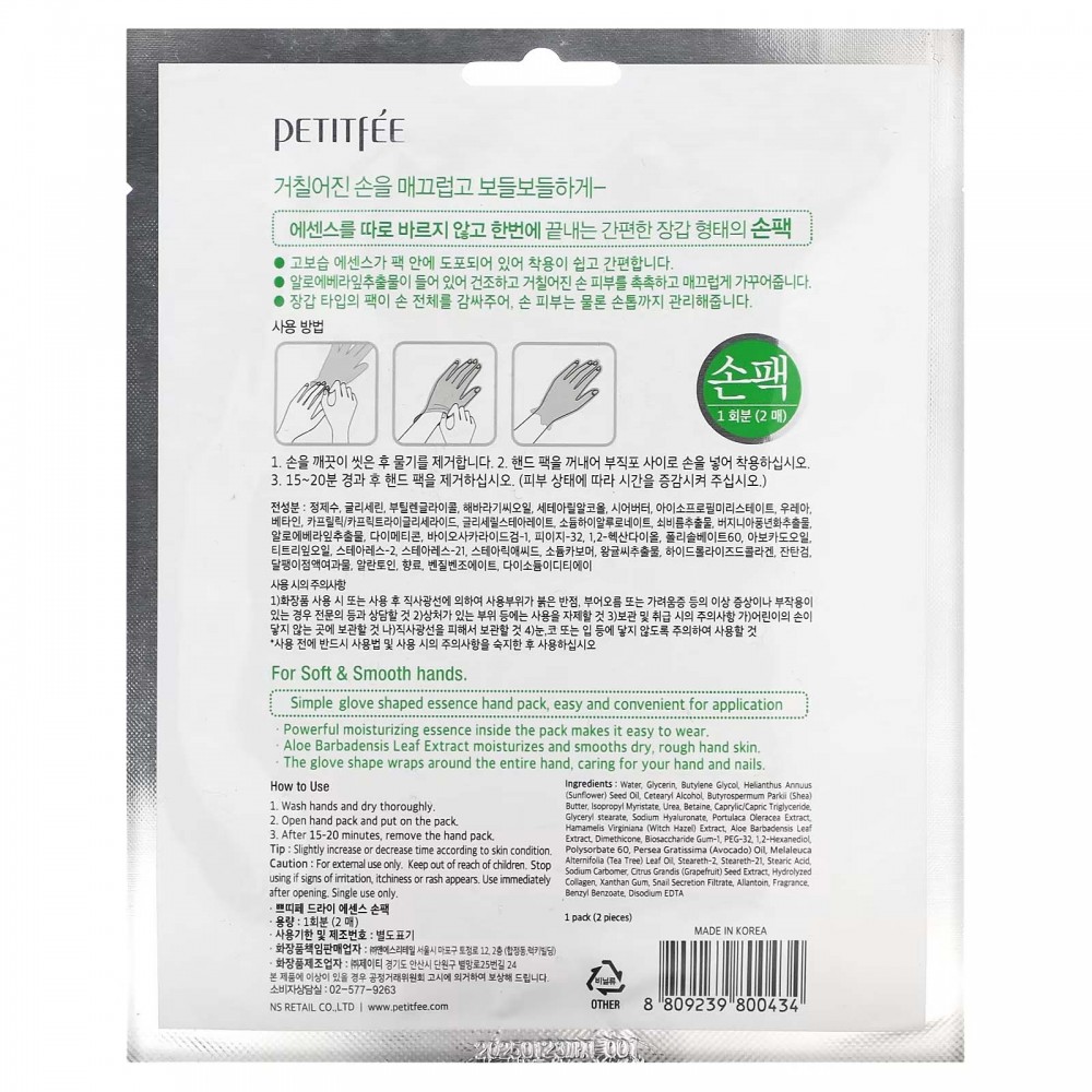 Petitfee, Dry Essence Hand Pack, маска для рук у формі рукавичок,1 пара
