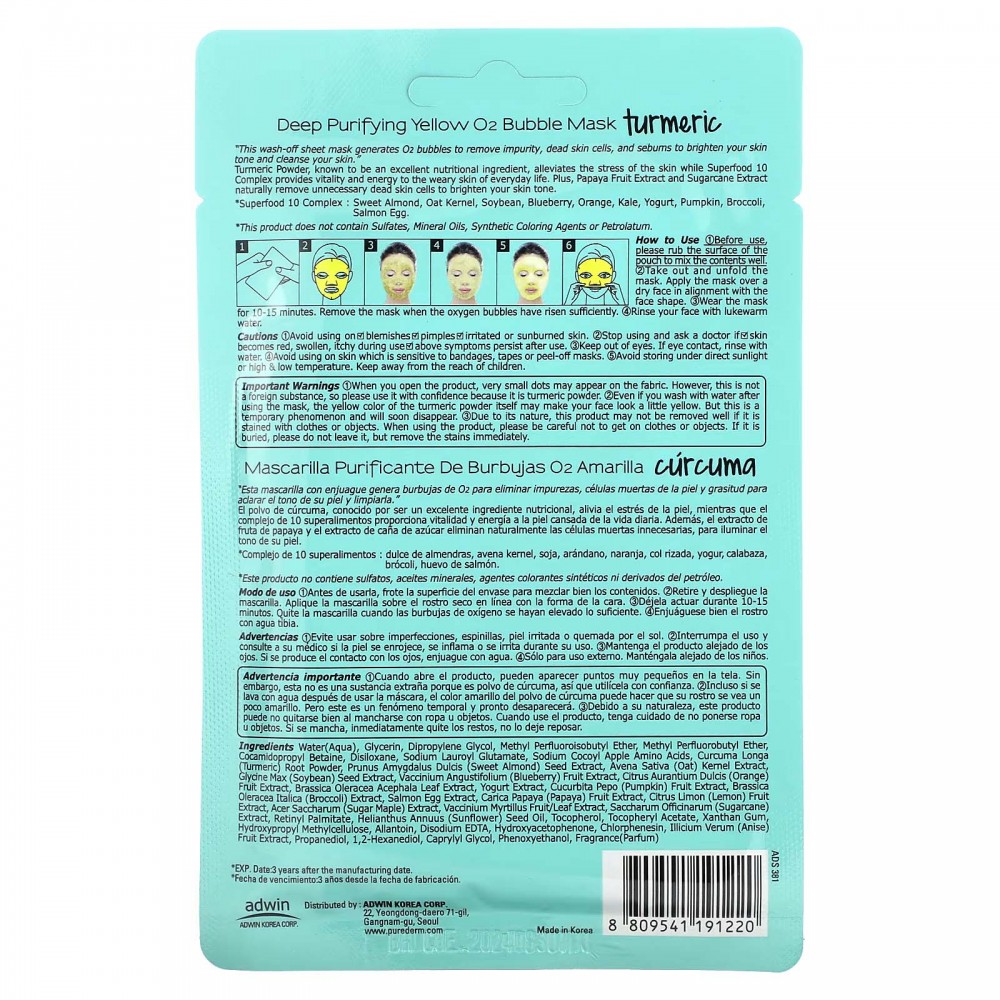 Purederm, Deep Purifying Yellow O2 Bubble Beauty Mask, маска з куркумою, 1 шт., 25 г