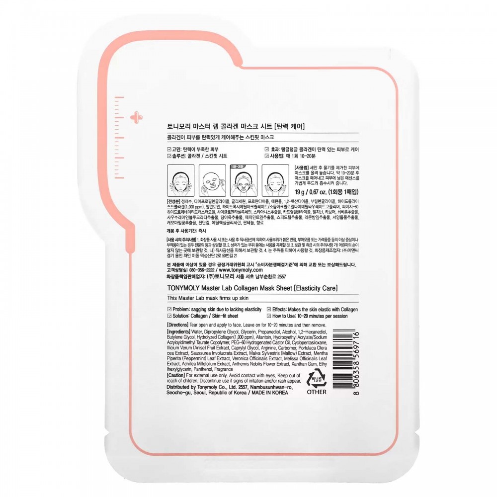 TonyMoly, Master Lab, Collagen Elasticity, 1 Sheet, 19 g